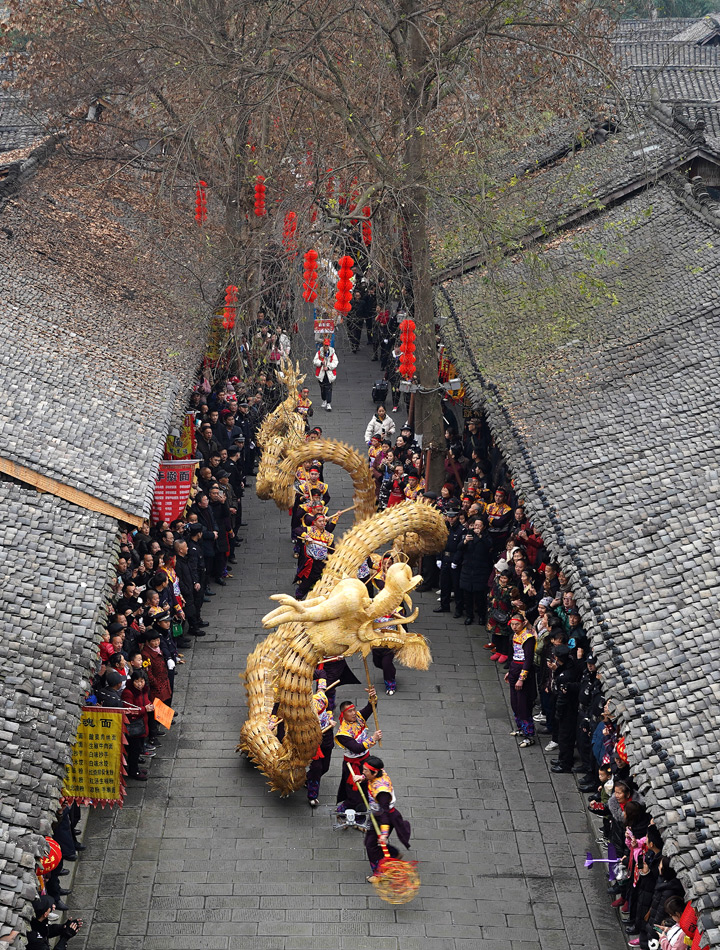 四川省閬中古城中天樓下,鱗次櫛比的老屋群落,金龍起舞鬧新春。