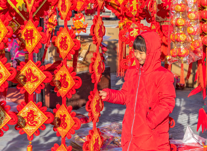 春節到來,鄉村大集年味濃,穿著紅色衣裳的小女孩專心挑選著喜歡的物品,過一個紅紅火火的大年。