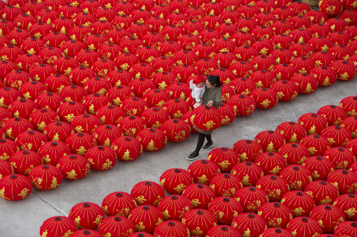 曬滿燈籠的場地上,年輕母親提著燈籠,抱著寶寶,喃喃低語,告訴他什麽是新年。