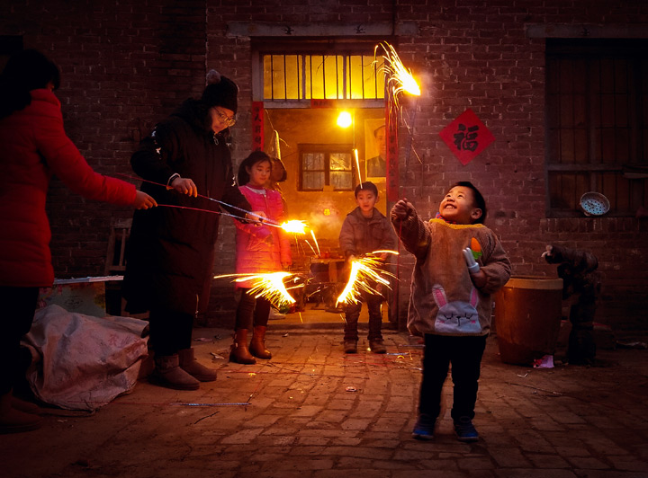 山東省聊城市陽谷縣,一家人放烟花開心過春節。