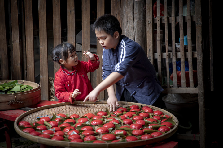 兩個小朋友在擺放象徵節日喜慶氣氛的紅團,爲紅團宴做準備。