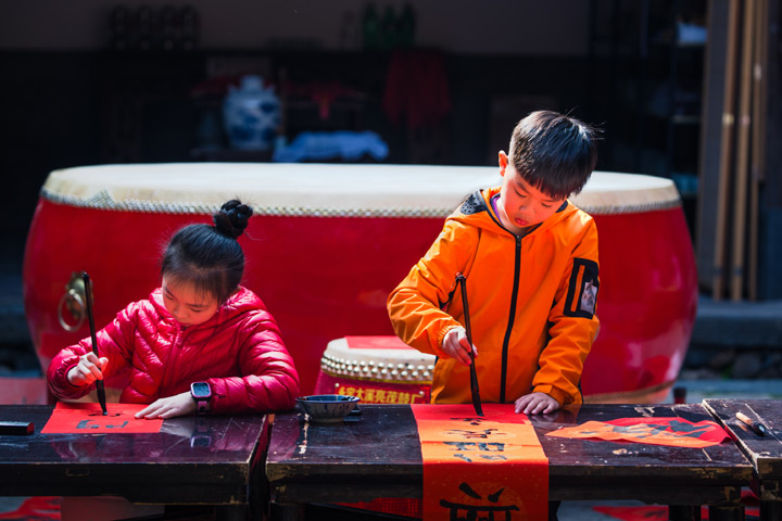 家住土樓的兩名小朋友用毛筆書寫春聯,瞭解客家楹聯文化,感受家鄉春節氛圍。