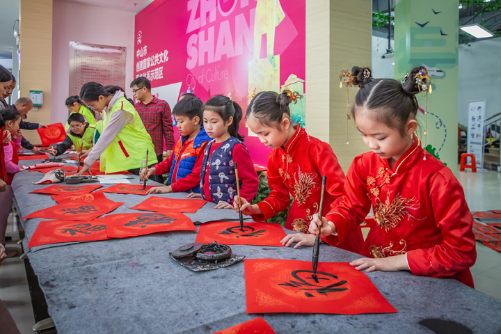 廣東省中山市火炬開發區文化站組織愛好書法的學生爲市民寫春聯、送福字,爲新春送上祝福。
