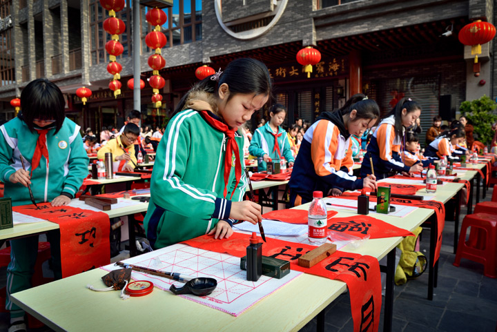 春節將至,小學生們在書春活動中揮毫潑墨,書寫自己對春節的美好祝願。