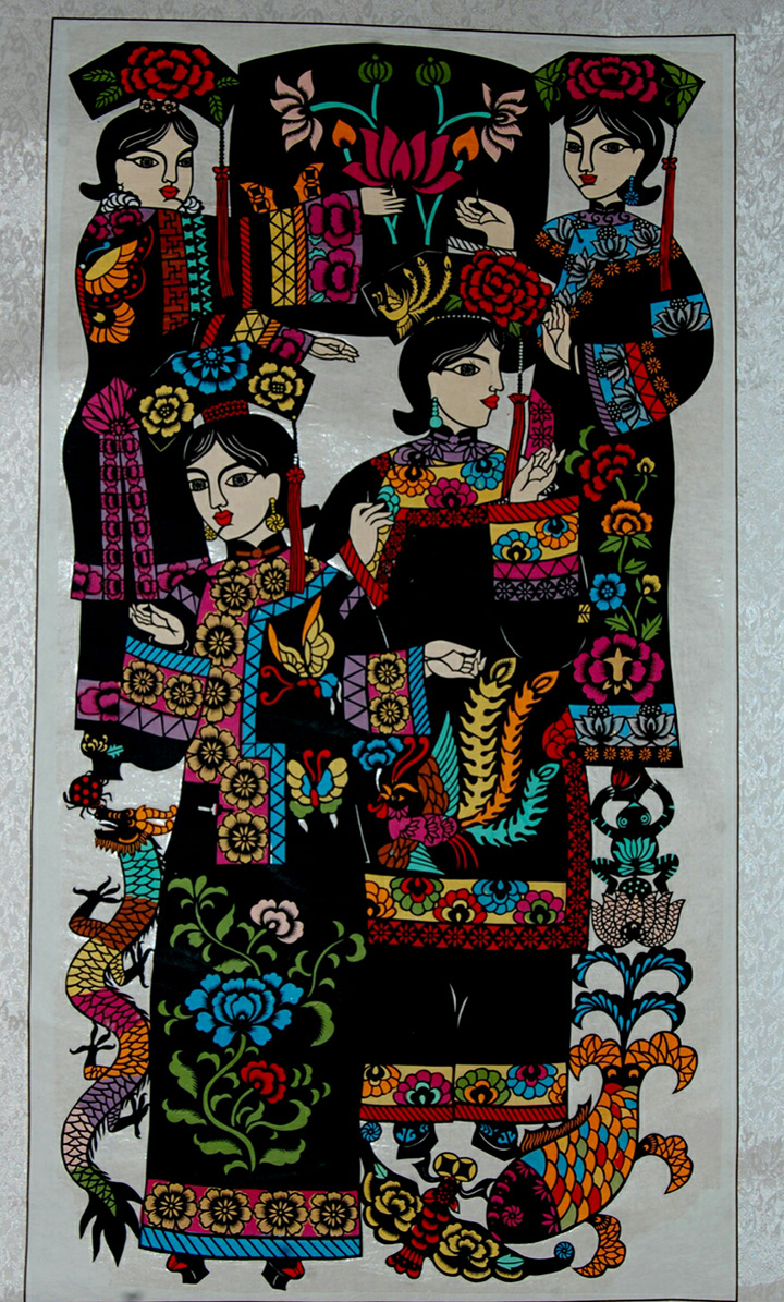 滿族是吉林省一個主要的少數民族。刺綉是滿族傳統的民間手工藝之一,綉品更是滿族家庭的日常擺設和用品。作品表現的是滿族婦女爲即將出嫁的女孩兒綉嫁妝的風俗。
