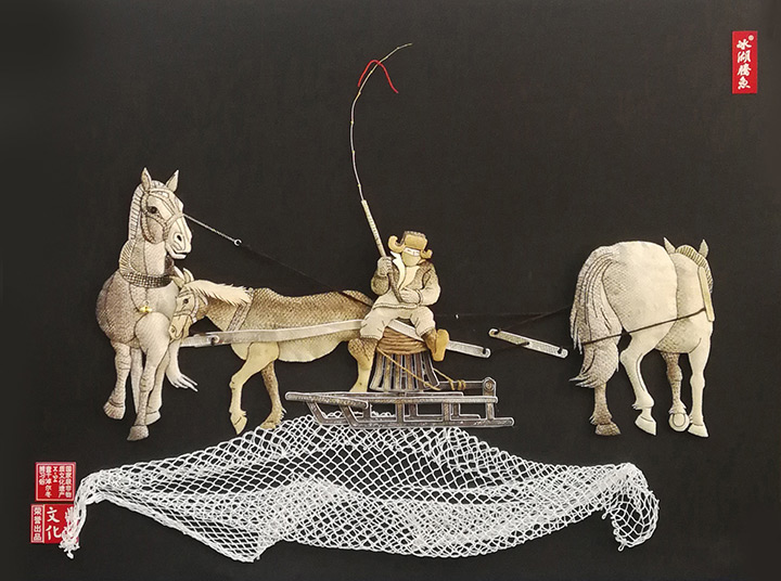 早在遼金時期,查干湖冬捕就享有盛名。祭湖、醒網、鑿冰、撒網,數萬斤鮮魚脫冰而出,極富民族特色。作品表現的是冰湖騰魚的場景,寓義美好富庶的生活薪火相傳。
