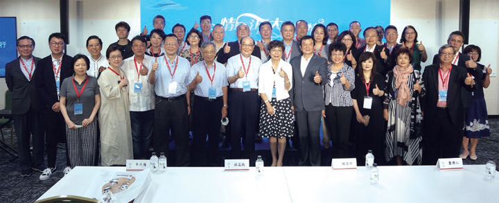 ▲(最前排左6起)文化台灣基金會榮譽董事長洪孟啟、台灣旅遊交流協會理事長賴瑟珍、旅行業全聯會理事長蕭博仁、海峽兩岸旅遊交流協會台北辦事處主任任佳燕,與文化、傳媒、旅遊、藝術等各界嘉賓合影。