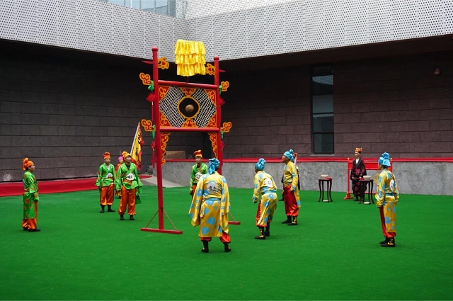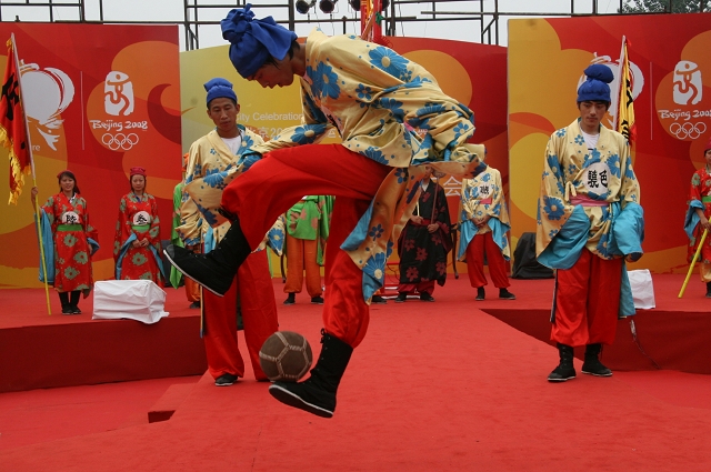 在中國山東臨淄足球博物館裡的蹴鞠比賽表演