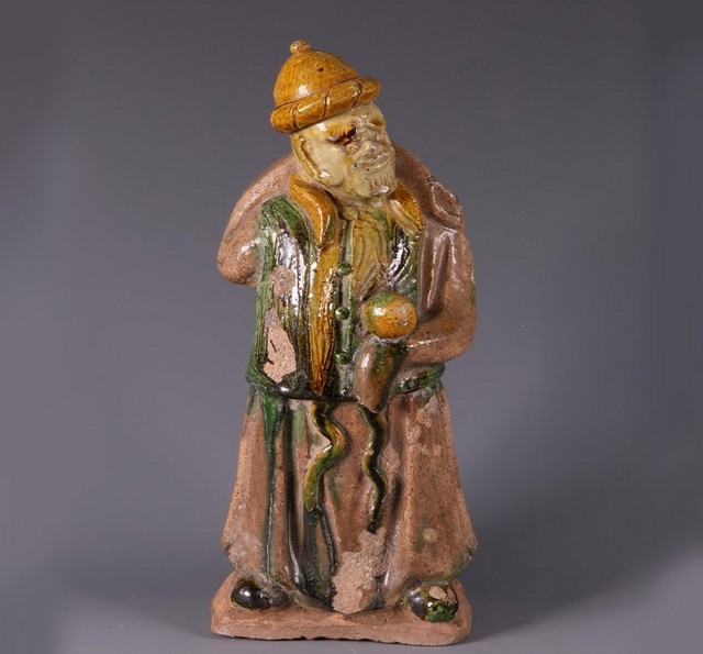 宋遼時期的三彩蹴鞠瓷俑,收藏於齊文化博物院。俑的形態是一胡人老者,頭飾尖頂卷沿圓帽,高鼻,雙目深凹,長鬍鬚,雙耳垂肩,身著長袍,襯前開身短衣,腳穿圓頭高靴,站立於方形基座上,右手抬至頸部,左手托一鞠,胸部露出四個圓形紐扣,歪頭斜視,似在思考。