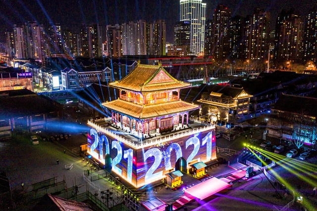 作為天津城市文化象徵和歷史見證之一的鼓樓,過往晨夕準時響起鐘聲,現今的跨年之夜,鼓樓鐘聲再次響起,伴隨著高科技全息技術呈現的燈光秀表演,傳遞出天津人民的祈願和祝福。