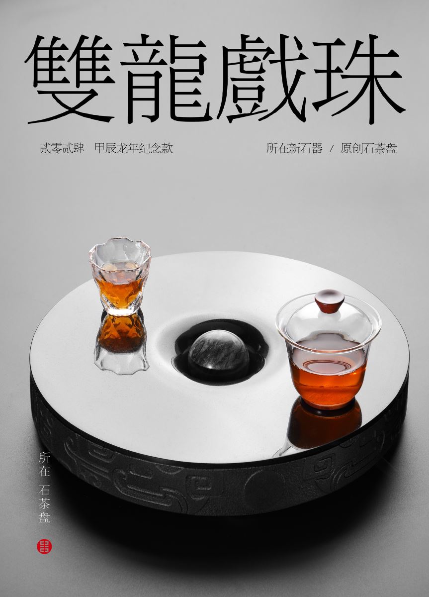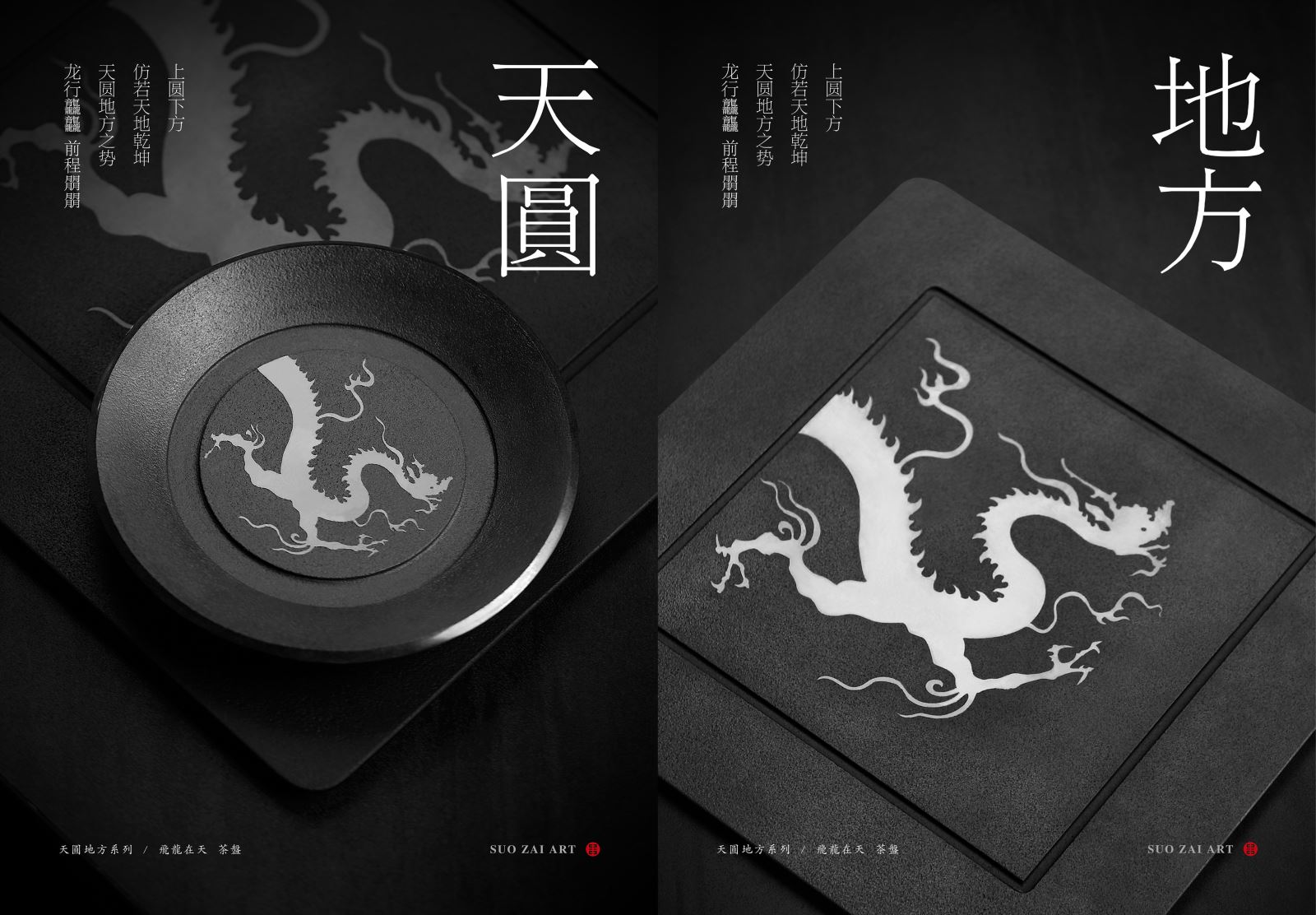 以幾何圓形為構造,整塊石料烏黑玄金,宛若星雲懸浮宇宙,如無盡的虛空;中間圓形凹槽配以石球,凹陷的黑洞,扭曲著無限的星空。整體側邊採用中國傳統圖紋夔龍紋設計,結合傳統雕刻技藝,使產品形成雙龍戲珠之態,讓傳統生活器具符合現代生活美學。