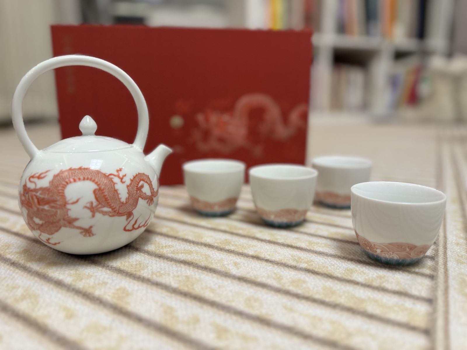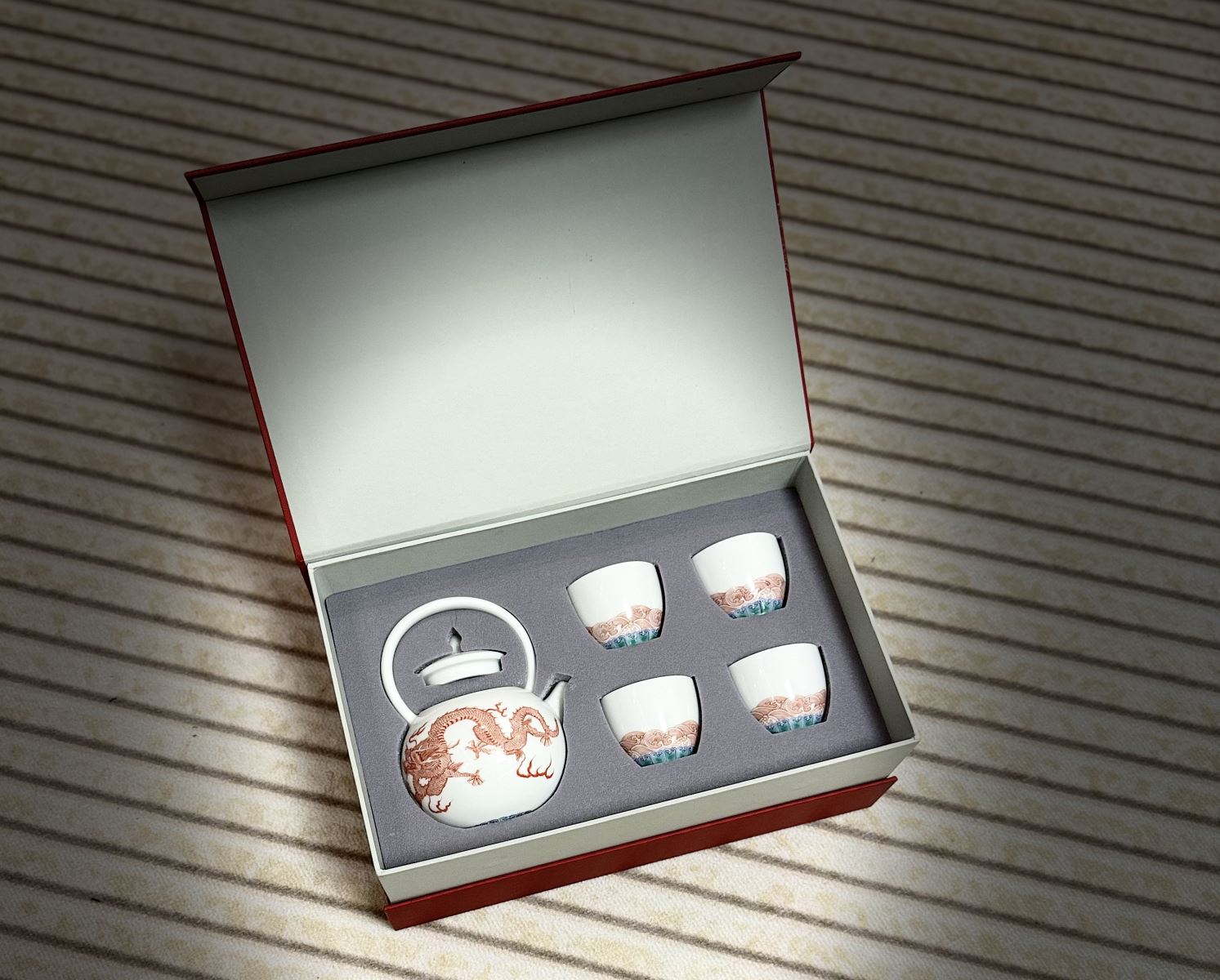 龍文化是中華傳統文化中流傳最為久遠的文化現象之一,龍在中華文化中象徵「祥瑞」。鬥彩紅龍鳳紋茶具組以小巧的茶壺為特點,克服了陶瓷提把較難燒制的生產技藝,設計靈感源自故宮博物院典藏珍品鬥彩紅龍鳳紋蓋罐,巧妙地把頭彩紋樣設計到杯的外型與茶壺的下半部,壺身以磯紅彩描繪龍紋,具有特殊的藝術效果。