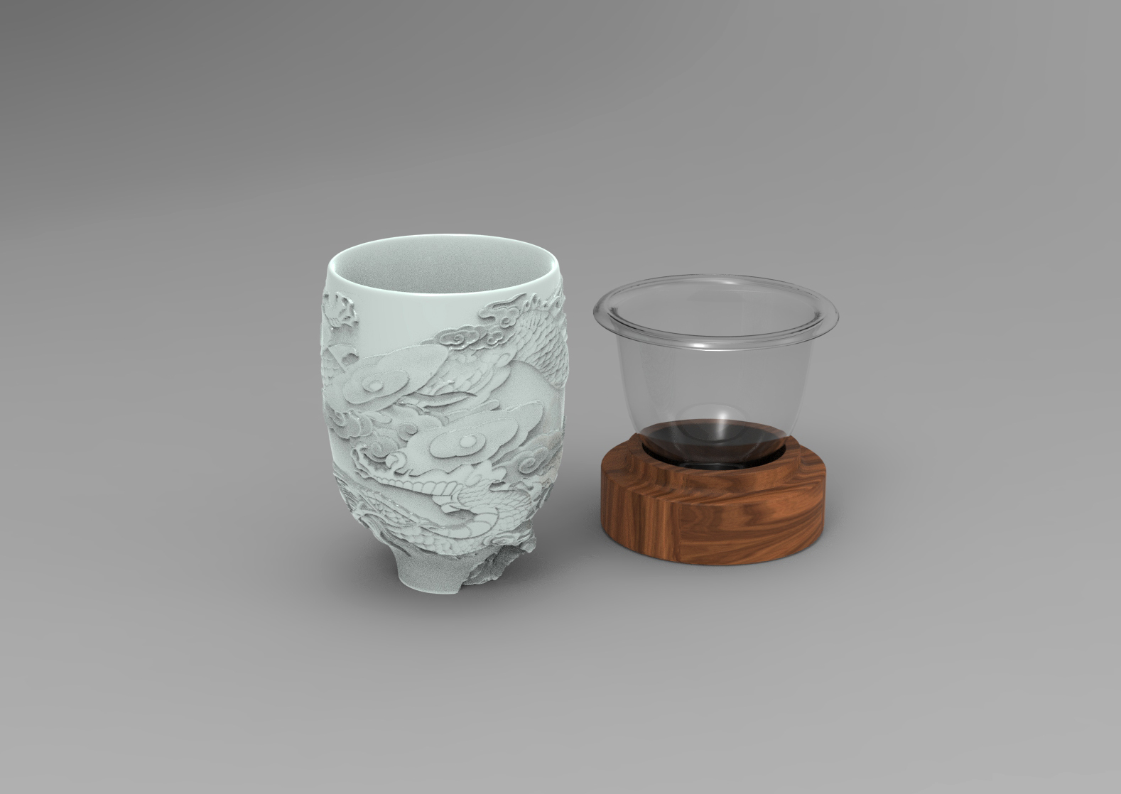 龍盤纏著杯子往上爬的設計。靈感來源於:因龍是神聖、威嚴的象徵,其身軀如山,龍盤纏著高聳入雲的峻峭山巔,仿佛是自然之力的象徵。