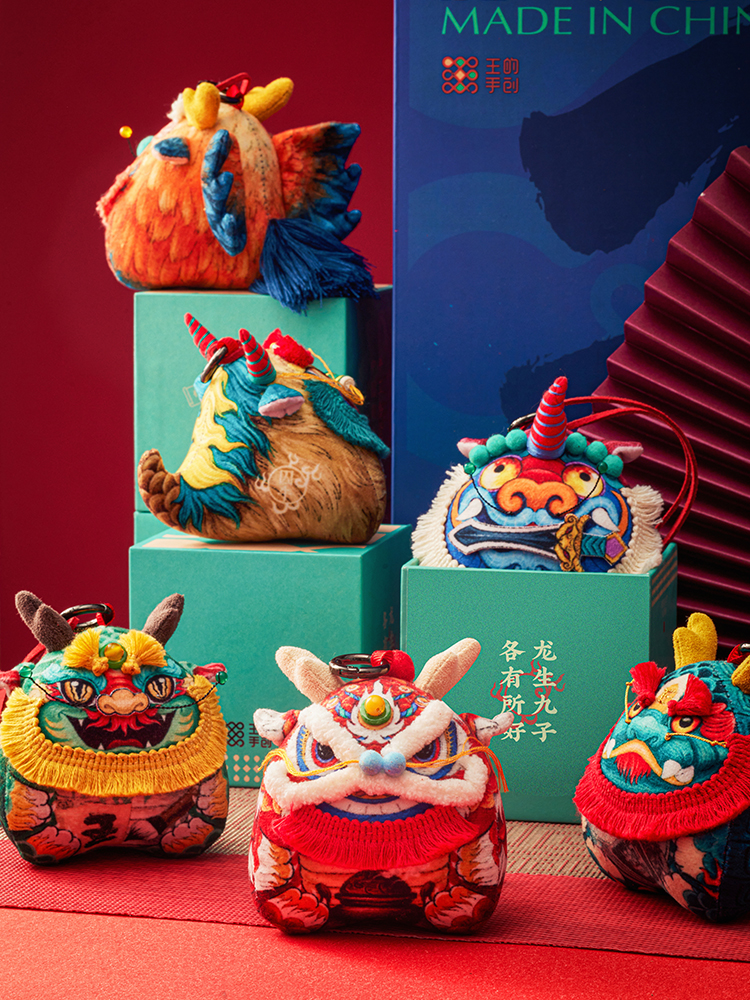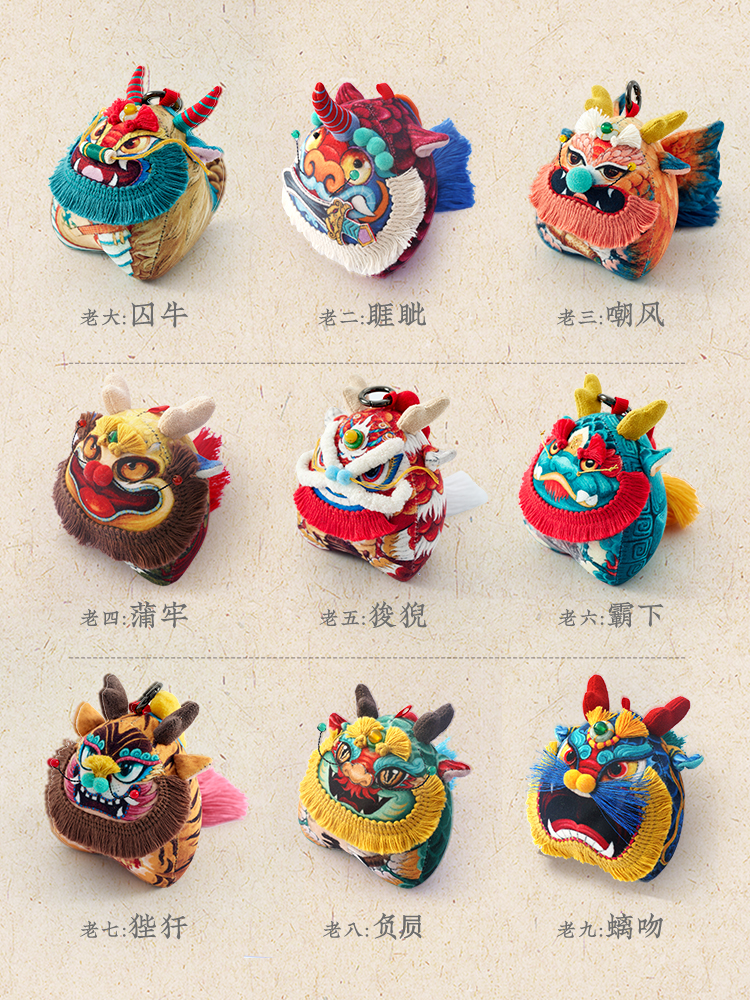 龍是中國古代傳說中的神異動物。龍是中華民族的象征,中國人都以自己是「龍的傳人」而驕傲。龍生九子,各有所好,外形都不像龍,運用其外部特征,做成樣貌各異的香囊,盲盒玩法,還有精致強手工的隱藏款、組合套裝。