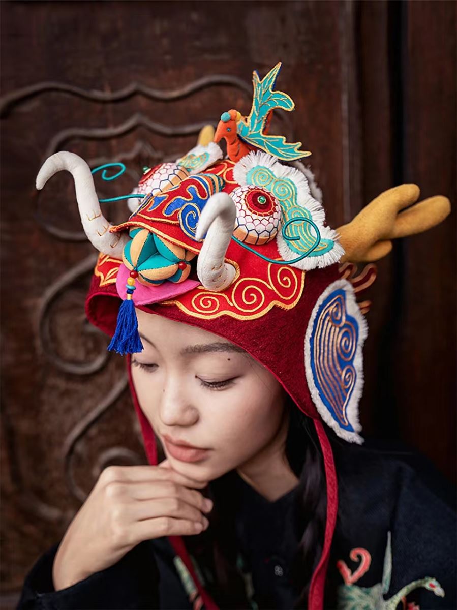 左為上,春為首,龍是春神,也是四象之首、百瑞之尊。一年之始,萬物復甦皆自龍始。中華民族民間戴龍帽意在有當龍頭之志,也象徵鴻運之兆。民間傳世作品本就稀有,奈何最精彩之作遠在大英博物館。於原作之上脫胎換骨,紅為主色象徵鴻運當頭。帽頂裝飾鳳凰,臥龍鳳雛便是中華氣度。近乎滿繡盤金,每一針都出自三十年以上繡娘之手,工藝精湛,可以傳家,請君珍惜。