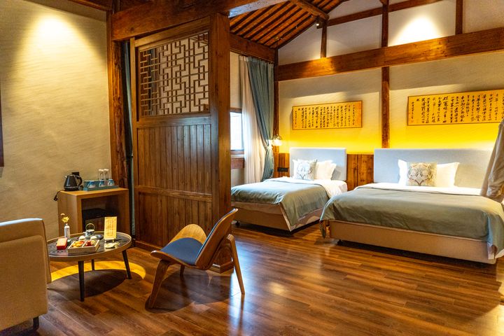 隱匿於績溪山水之間,推窗即景,滿目蔥蘢,春可賞花,夏可避暑,秋看紅葉,冬可觀雪,特別是秋天的牛屋山美得像似一幅油畫。客房皆為觀景房型,玻璃落地窗搭配超大陽台,寬廣的視野,帶來山林不同角度的美輪美奐,讓顧客足不出戶,便能將山林風光盡收眼底,觀光山景亦自由愜意。