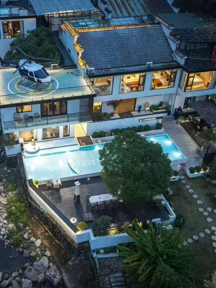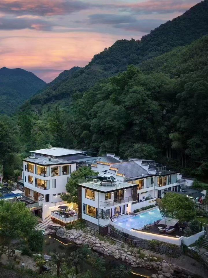 山莊周圍分佈15000多棵珍稀樹種红豆杉,負氧離子異常豐富。山莊座擁300畝百年老樹茶園,原生野茶直供賓客;整體採用徽派建築風格,白牆黛瓦,亭台樓閣,古色古香;小溪蜿蜒,水流潺潺,群山環抱,林深樹茂,鳥語花香。
