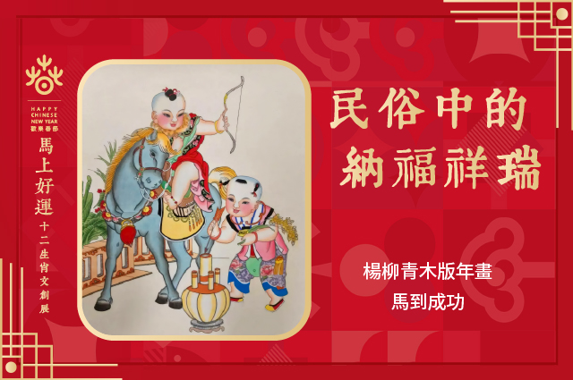 2006年,楊柳青木版年畫入選大陸第一批國家級非物質文化遺產名錄。馬是楊柳青木版年畫中極具代表性的吉祥意象,常與各類瑞物、紋樣相融,借諧音與具象構圖傳遞美好期許。如「馬上成功」作品中可見孩童騎於馬背之上,手中挽弓,以「馬背之上」表達「馬上」的期許,「弓」諧音「功」,含蓄道出「即刻成功」的美好祝願。