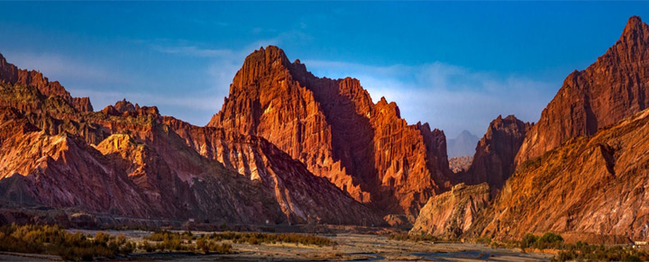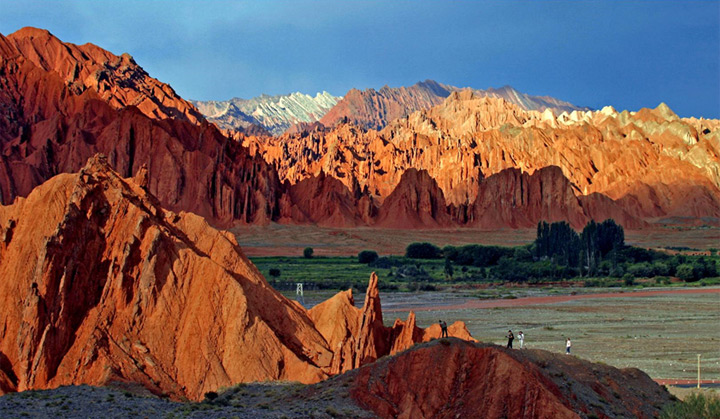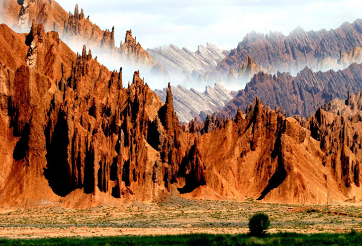 從庫車出發向北,一路上都是疊嶂起伏的自然風光,穿過天工神韻的雅丹地貌、直穿雲霄的鹽水溝風景區,66公里的路程處處讓你驚歎不已,在眾多的山巒中,紅山石林赤紅的山體更是令人陡然一亮。山體呈紅色,原海底的岩石由於造山運動而形成的直立的單斜岩石組成了層層疊疊的“石林”,分外壯觀,與附近不同色彩的山體錯落有致,交相輝映,構成一處天山奇觀。一年四季都有諸多攝影愛好者、畫家來這裡采風、創作。