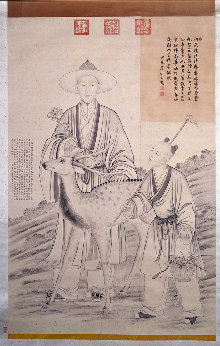 畫面中身著漢族衣冠的青年男子清雅飄逸,宛若仙人,他右手輕執如意,左手輕撫梅花雄鹿,神態安然。側旁陪伴一提藍荷鋤的少年。少年與雄鹿的眼神都望向青年男子的眼睛。這位青年男子的五官及臉型正與弘曆登基時的“朝服像”極為接近,根據圖中右上方弘曆自題詩及他所鈐 “寶親王寶”印文可以確定,此人正是弘曆本人。而此圖作於雍正十二年,此時弘歷年齡24歲。一年後,雍正皇帝駕崩,弘曆成為了清王朝的新皇帝,並改年號為“乾隆”,正式開始了長達六十年的統治。
