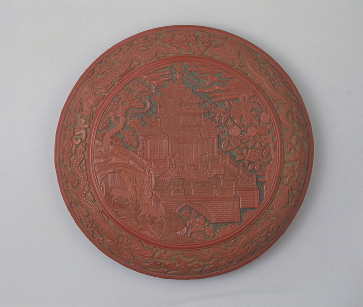 圓體,器壁做適度弧形收斂,形成上下對應的平頂和平底。通體雕紅漆的花紋。蓋面中央高樓聳立,巍然壯觀,露臺上仙鶴一隻與空中飛來之鶴遙相對舞鳴叫,兩磅是虯曲茁壯的松樹和果實累累的桃樹,地上靈芝一株,天上祥雲層層,松樹前一深邃洞府,兩隻神鹿一前一後緩步走出,整體畫面層次井然,動靜相偕,蕩漾著福瑞祥和的氣息。外周環飾雲龍和靈芝,外底中央陰刻戧金單豎行“大明嘉靖年製”楷書款。