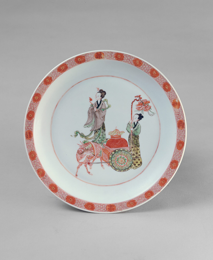 一大壇美酒裝滿花車,荷葉形蓋覆蓋其上,麻姑衣帶飄飄,手持靈芝側立車旁,飄然若仙,花鹿回首相望,一侍女立於車後,手持高杖過頭,杖鉤卷著書卷、靈芝,麻姑與侍女均側視前方,似要向前趕路、祝壽。 此盤繪工精細,運用紅彩、綠彩、黃彩、黑彩、禇彩等五彩描繪,尤其是黑彩表現人物的髮髻、服飾、車輪,漆黑濃重,為康熙五彩瓷器的施彩特徵。