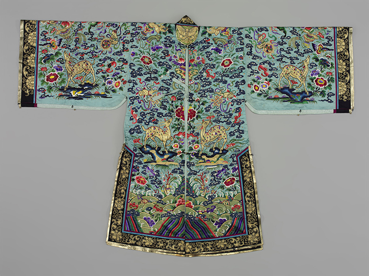 11. 湖色緞繡折枝花雲蝠金鹿紋二變男帔