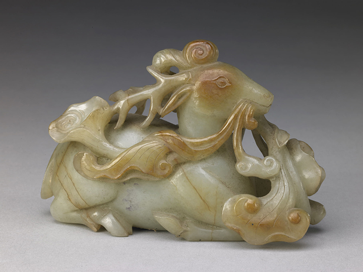 本品整體為青玉質,玉質較好,拋光,玉材部分留有皮色。鹿較肥碩,四肢曲臥,鹿頭微微向一側傾斜,其上雕有葉狀肉瘤,角分多叉,傾於頭後與背相連。鹿口銜纏枝靈芝數枚,靈芝枝葉飄逸,向鹿身後隨風擺動,恰似仙山神草。鹿尾短但較肥大,垂於臀後,蹄碩大而有力。靈芝雕刻時利用玉材本身之皮色,部分稍加以人工上色,設計巧妙,獨具匠心,彰顯明代工藝蘊含古韻的同時,也不失體現玉材的自然之美。