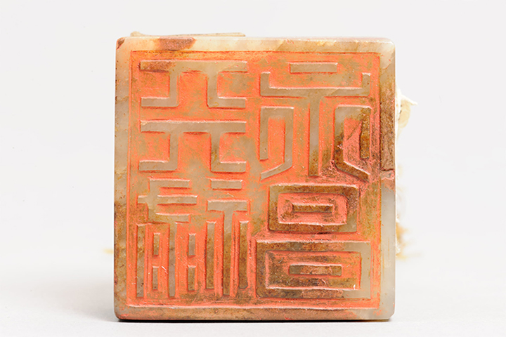 青玉質覆鬥紐方形璽,印模正方形,陽文篆字,二行各二字。印紐上刻有雙夔龍紋,四周刻回紋,青玉經煮抹而成仿古色。“天祿”是指天賜的福祿,意思是壽命長久;“永昌”是一直繁榮昌盛之意。這裡是祝福語,出自《論語·堯日》篇中:“四海困窮,天祿永終”句。故宮現藏“天祿永昌”印13件,僅有1方為陽文。 (說明:惲麗梅)