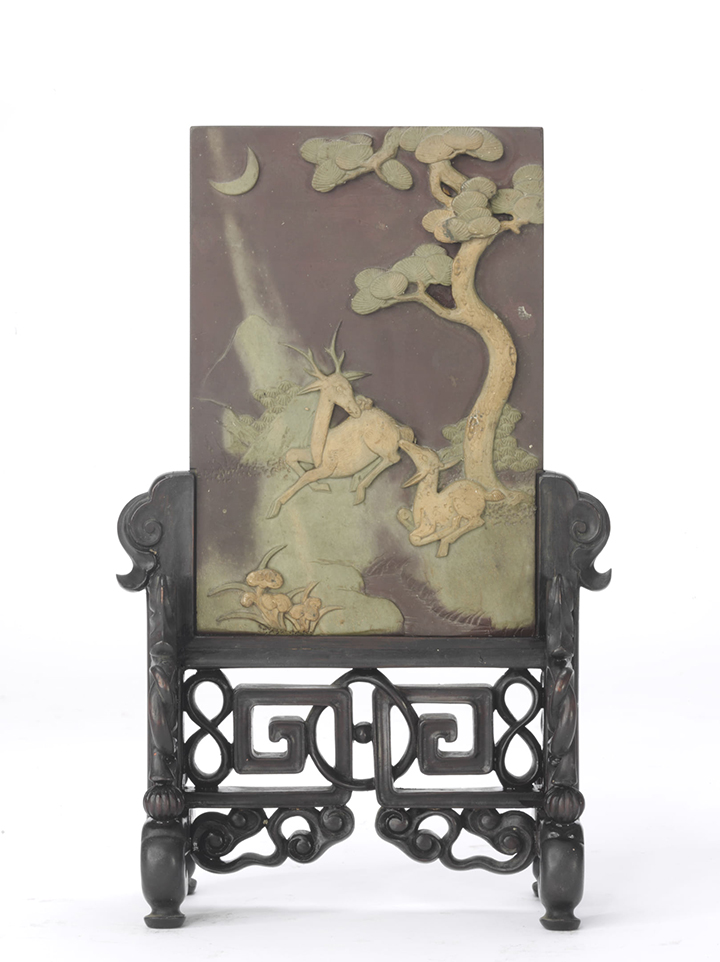 此插屏充分利用紫石的天然俏色,描繪出午夜月光如水傾瀉,照亮松下靈鹿、仙芝沃土的美麗景象,朦朧虛幻、如詩如夢。 (說明:趙贏贏)