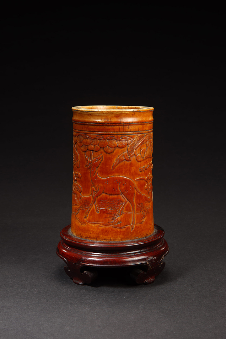 筆筒用象牙雕成,直筒形,底座為後配。外壁雕有雙鹿,一臥一立,均作回首狀望向天空中的飛鳥。松樹枝繁葉茂,針葉鬱鬱蔥蔥,兩隻猿猴正在玩耍,一隻立於樹幹之上,右手扶枝,左手持樹枝前伸,另一隻蹲於樹下雙手捧起,兩猴狀似採摘松果,松下另點綴有靈芝及蜻蜓。 此器採用陰刻配合淺浮雕工藝雕成,於粗獷中蘊含著質樸。 (說明:謝麗)
