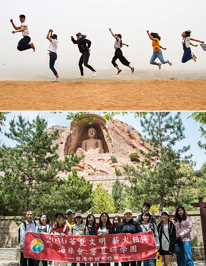 【上圖】沙漠上比誰跳得高。【下圖】固原須彌山石窟前合影。