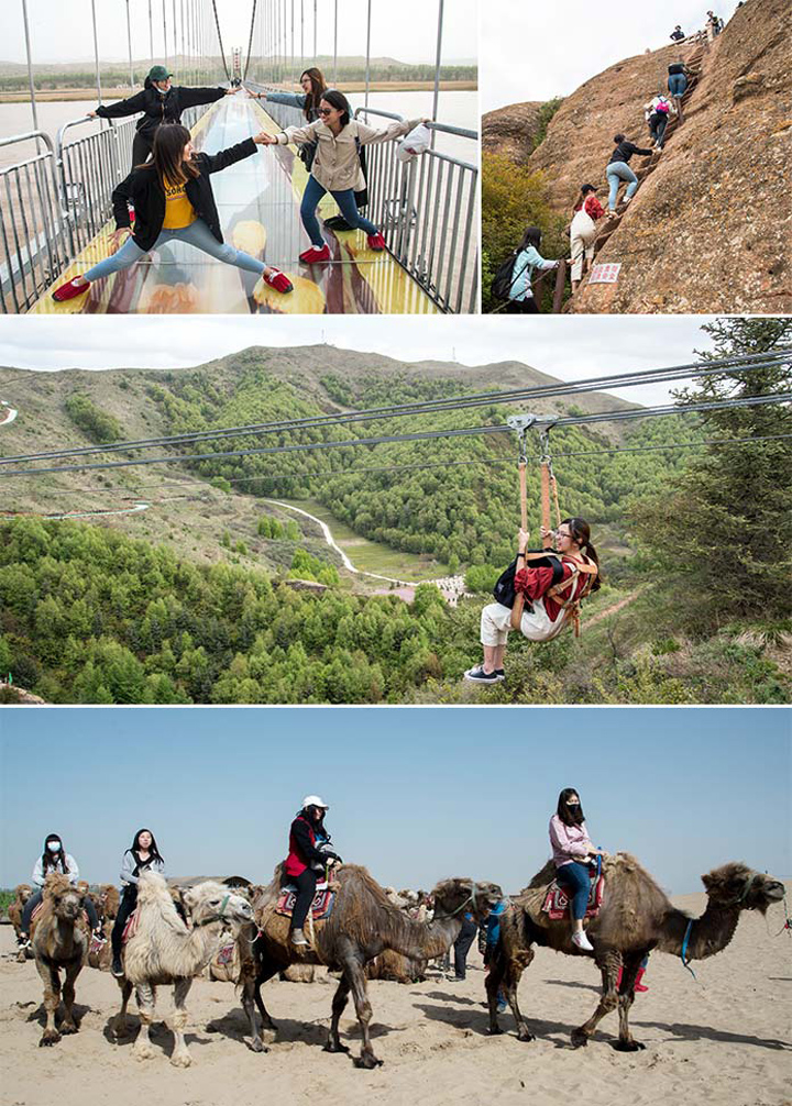 【中圖】雲台山體驗飛索橫渡。【下圖】團員沙湖騎駱駝體驗。