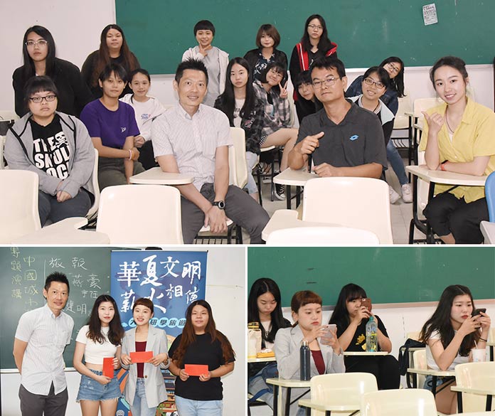 【上圖】中州科技大學觀光與休閒管理系主任兼副教授藍美英(前排右4)、旅報行銷企劃主任謝燕豪(前排左1)、靜宜大學觀光事業學系碩士班廖盈璇(中)與同學合影。【下圖左】中州科技大學保健食品系白晏濡。【下圖中】旅報行銷企劃主任謝燕豪頒(右1)發送7-11禮券給有獎徵答獲獎同學。【下圖右】學生對大陸研學感到興趣。