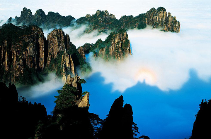 黃山位於安徽省南部黃山市境內,爲“三山五岳”中的“三山”之一。景區內有名可數的景點多達800餘處,一千公尺以上的山峰有77座,命名的有36大峰,36小峰。三大主峰都在1800公尺以上,且各有特點,如蓮花峰瑰麗,光明頂高曠,天都峰險峻。奇松、怪石、雲海、溫泉、冬雪俗稱黃山“五絕”。名松一百多棵;怪石有名可數的有一百二十多處,它們巧奪天工,妙趣橫生,尤其是與奇松相映成趣,分外瑰奇;雲海,是黃山的魔術大師,使山靜中有動、動中有靜;溫泉,屬碳酸鹽型,水質可浴可飲,水溫長年保持在42℃左右;而冬雪,更是遊人公認的一絕,美不勝收。1990年,黃山被列入“世界文化與自然雙重遺産”名錄。