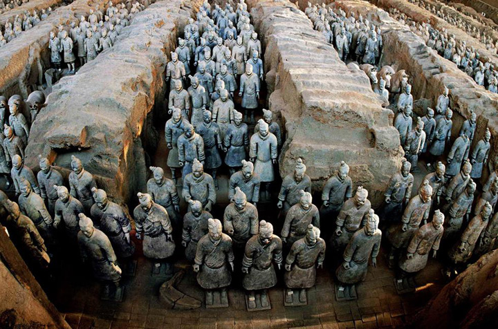 秦始皇陵及兵馬俑坑位於陝西省西安市臨潼區驪山北麓。陵墓建於公元前246年至公元前208年,現存墓封土高40公尺。陵園布局仿秦都咸陽,分內外兩城,內城周長約2.5公里,外城周長約6.3公里。兵馬俑坑位於秦始皇陵東側,是秦陵的大型陪葬坑,1974年被發現。現已挖掘四個坑,面積共2.5萬餘平方公尺。坑內叢葬大量與真人真馬等同大小的陶制彩繪兵馬俑和當時實戰使用的各種兵器。出土文物達萬件之多。