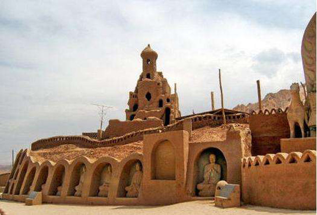烟雲燎繞的火焰山下,鬱鬱葱葱的木頭溝畔,一座規模宏大的人文景觀,以其獨特的藝術風格,屹立在312國道西側,它就是新疆大漠土藝館——萬佛宮。土藝館融建築、壁畫和雕塑藝術爲一體;把地面景觀和地下洞窟有機結合,雄渾粗獷,大氣磅礴,把奇特雄偉的大漠風采表現得淋漓盡致,使蜚聲海內外的大漠生土藝術在吐魯香火焰山這一特殊環境裏發揚光大。