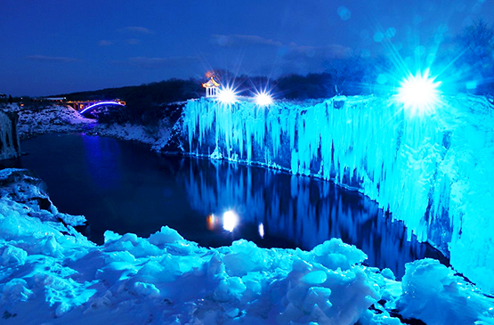 然後參觀【吊水樓冰瀑】、【冰瀑跳水】。鏡泊湖冰瀑是大陸最美的冰川瀑布,零下二十多度的氣溫,讓吊水樓瀑布停下了腳步,沒有了夏日裏萬馬齊喑的喧鬧陣勢,此刻靜靜地停留在了瀑布之上,化成了千萬冰棱。同時,這裏也是世界上唯一有著懸崖冰瀑跳水表演的名勝景區,可以欣賞到載入吉尼斯世界紀錄的“懸崖跳水第一人”狄煥然的冰瀑跳水表演。