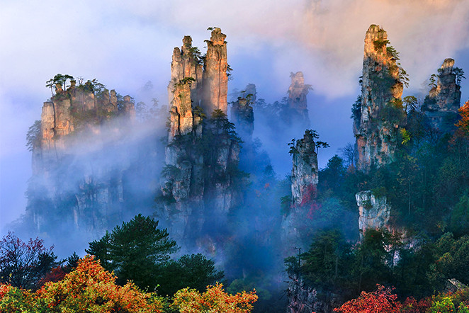 【張家界森林公園】位於武陵源區,分為黃石寨、金鞭溪、袁家界、楊家界、天子山和索溪峪等區域,是遊玩張家界不可不去的核心景點。三千多座造型奇異的山峰拔地而起,滿目青翠。峰穀間雲霧繚繞,隨處可見飛瀑溪水,風光美不勝收。這裏的龍蝦花茶外形獨特,色澤隱翠而略顯金黃,滋味醇甘爽口,是湖南的一類名茶,值得一試。