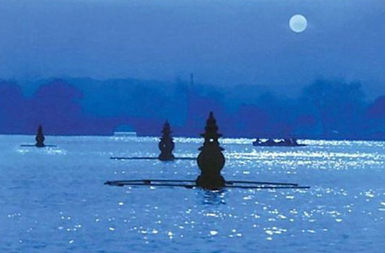 【三潭印月】又稱“小瀛洲”,位於西湖中部偏南的湖面上,是西湖三島中面積最且、唯一能上島遊覽的一個。島嶼的輪廓像一個“田”字,外圈的環形上是優美的江南園林,內部被十字形的島和橋分割成四個小湖。上島後遊玩時間不限,遊玩結束後可憑票回到以上任意一個碼頭,非常方便。