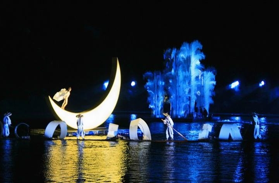 觀賞實景表演【印象劉三姐】。《印象劉三姐》的演出地點位於漓江與田家河交匯處,與書僮山隔水相望。舞台是一片方圓兩公里的漓江水域,背景是十二座山峰,非常大氣,也是全世界最大的山水劇場。