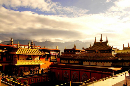 大昭寺是藏王松贊干布爲紀念尺尊公主入藏而建 是西藏現存最輝煌的吐蕃時期建築,也是西藏最早的土木結構建築,開創了藏式平川式寺廟市局規式。大昭寺殿高4層,整個建築金頂、斗拱爲典型的漢族風格。碉樓、雕梁則是西藏樣式,主殿二、三層檐下排列成行的103個木雕伏獸和人面獅身,又呈現尼泊爾和印度的風格特點。